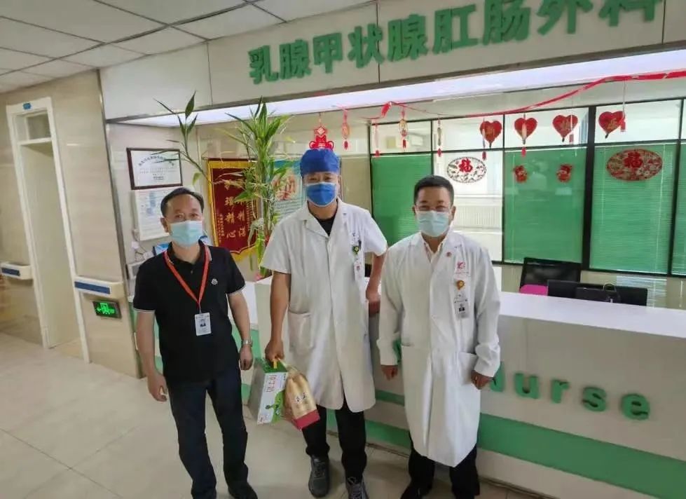 临近中午,得知普外科三病区主任李刚下了手术台,院长党委副书记李忠原和副院长艾立辉来到科室,为他送去慰问品并表达感谢。李院长握住李刚主任的手,亲切的说:“感谢援庆医疗队队长吴丽红的挺身而出,感谢李刚主任的支持和担待,你们夫妻两一个在一线身先士卒,一个在医院为百姓守护健康,你们为医院做出了巨大的贡献,为社会稳定和疫情防控贡献了自己的力量,是值得全院职工学习的榜样。”李刚主任表示作为医务工作者,白衣执甲是职责所在,无论何时,必将战疫情,护健康,不负祖国和医院所托。