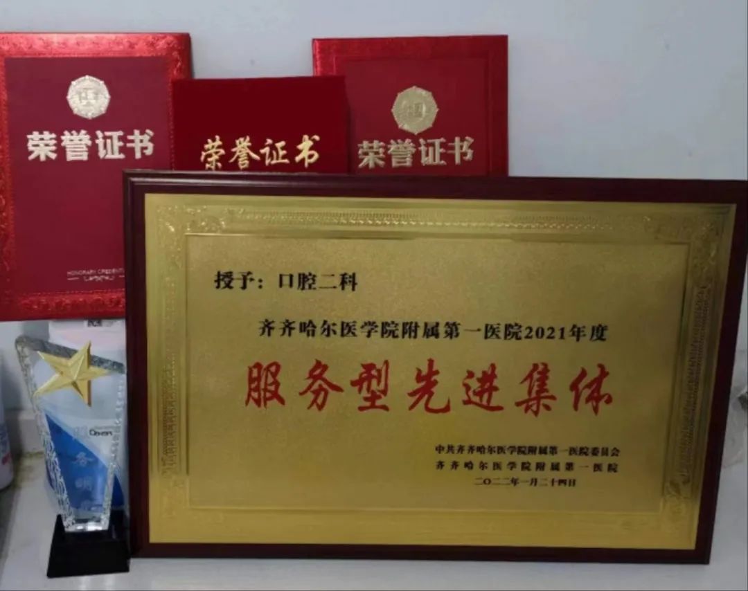 齐齐哈尔医学院附属第一医院口腔二科现有医生6人,党员4人。是一支朝气蓬勃、责任心强,致力于为人民服务的年轻队伍。近几年来,口腔二科在科主任薛徽博士的带领下,以严谨务实、一丝不苟的工作态度,坚持“以患者为中心”的理念,以提高患者满意度为目标,从提高队伍整体素质出发,把服务质量当作头等大事,不断优化服务流程,树立了科室的良好形象,并荣获2021年度“第二季优质服务——服务型先进集体”荣誉称号。