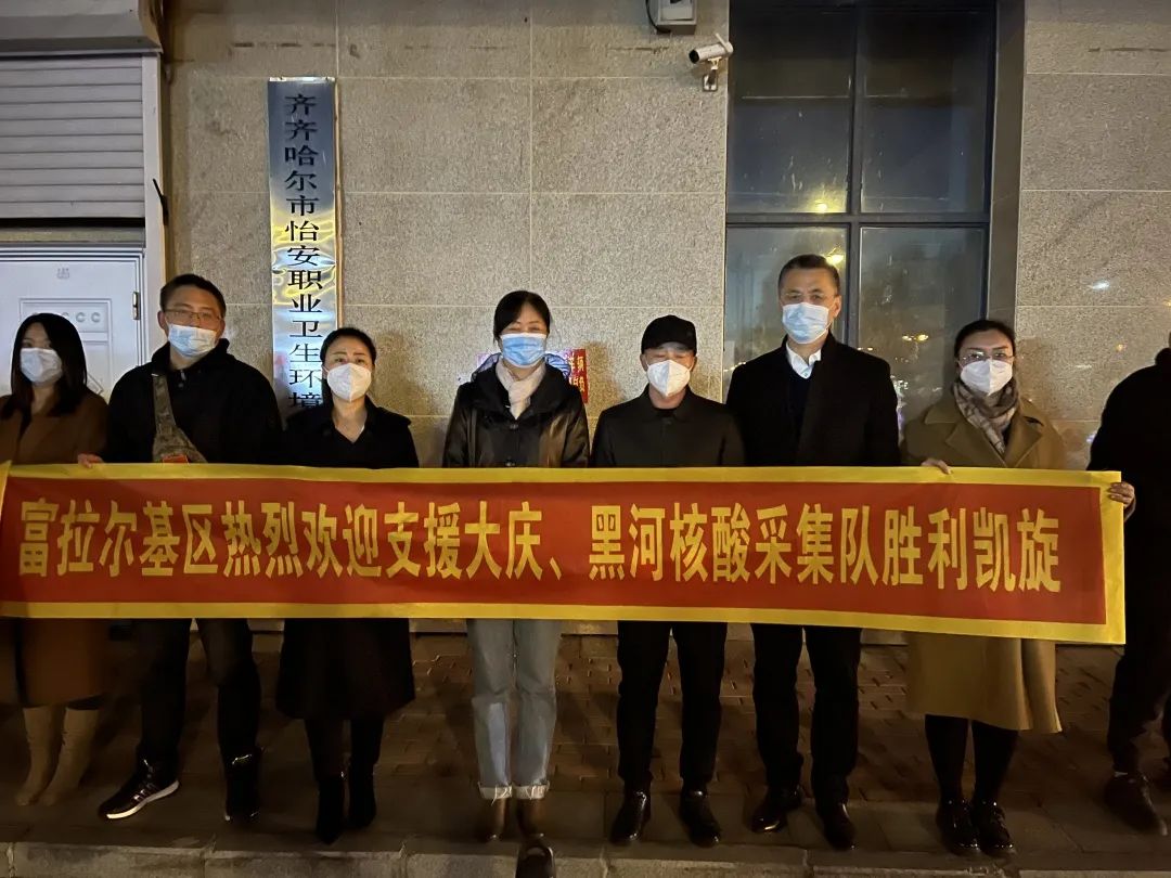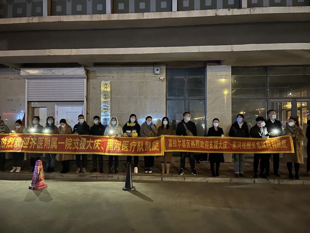披甲逆行,荣光归来。10月18号晚,齐医附属一院支援大庆黑河医疗队20位英雄们圆满完成驰援一线的核酸采集任务,不负众望平安归来。我院党委书记刘晖、副院长刘增良,富拉尔基区卫健局局长张士忠及我院部分医护人员到现场迎接。