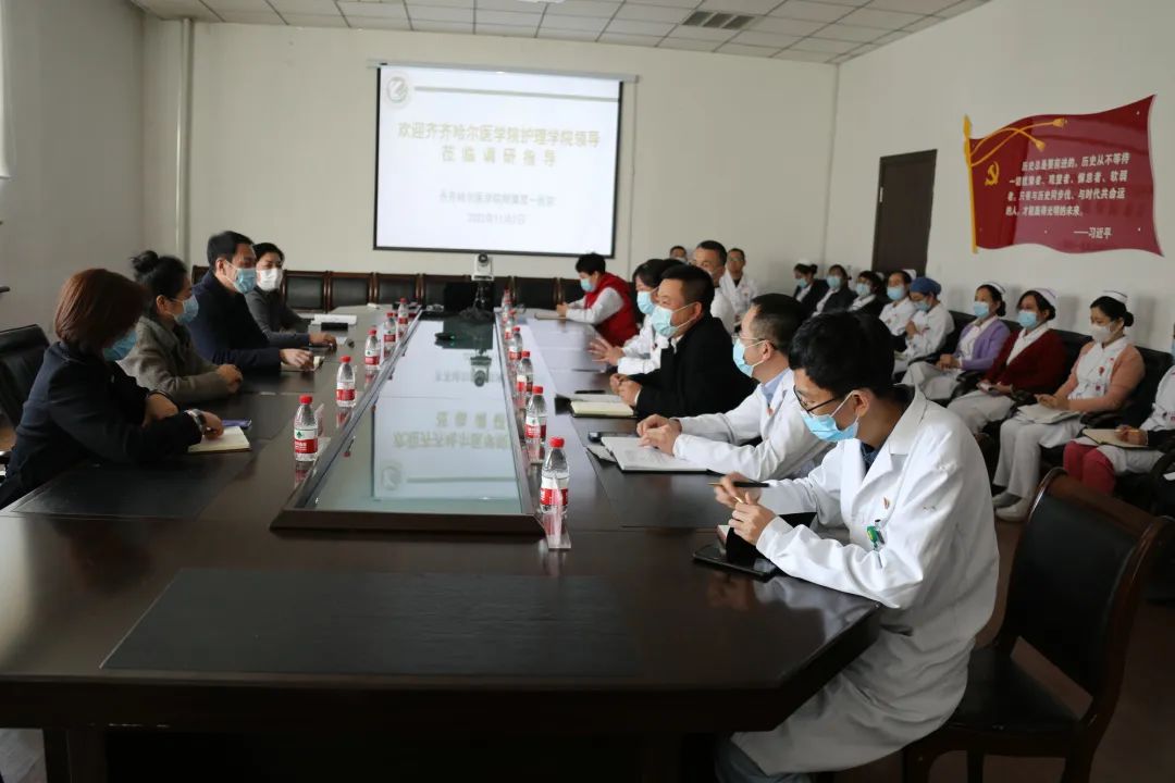 11月2日下午,齐齐哈尔医学院护理学院党总支书记李强,院长、党总支副书记高音,党总支副书记付桂华,副院长李桂玲、马秀梅等一行6人来到我院,就学院护理硕士点申报及运行、护理学生教育管理、人才强院等情况进行调研。院领导及护理部、医务部、人事科、教务科、学生科、科研科负责人及护理教师代表参会。会议由副院长刘忠锦主持。