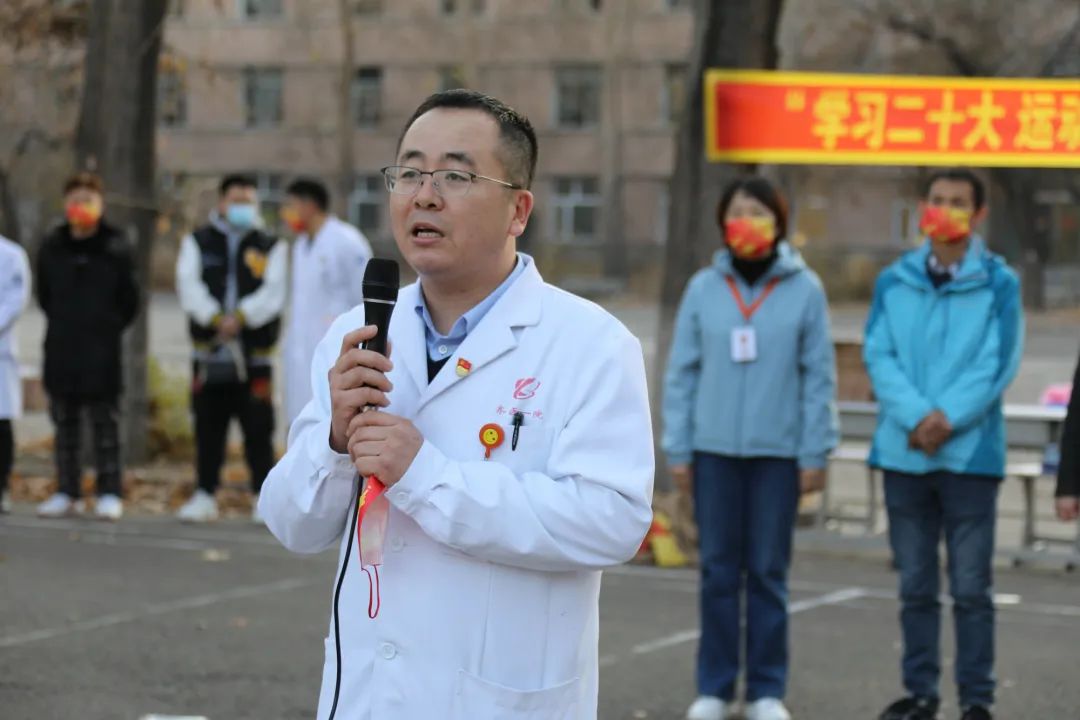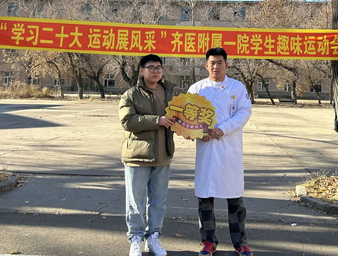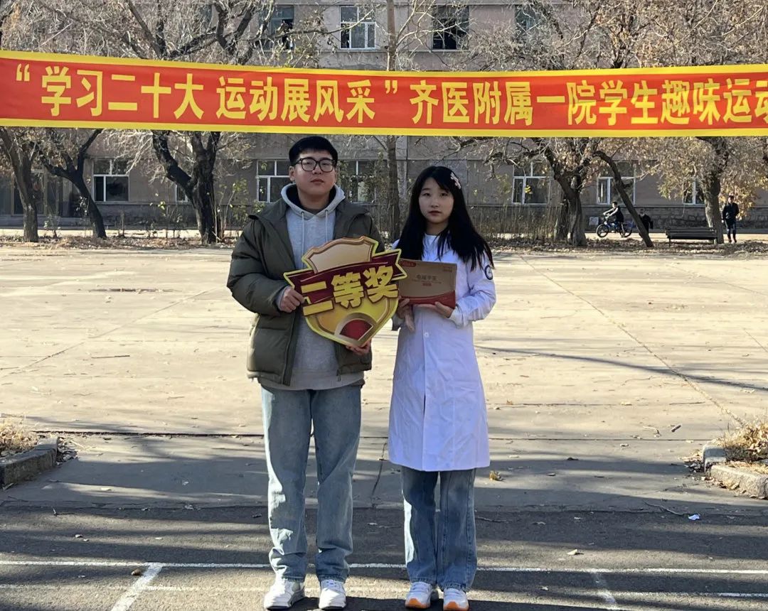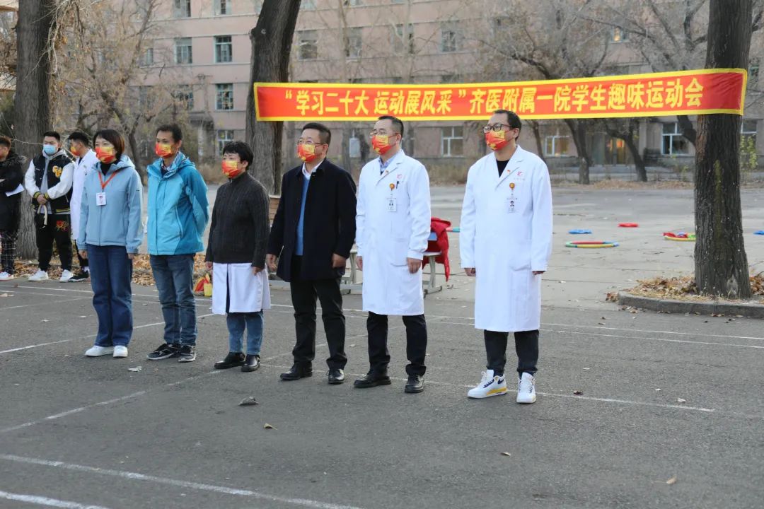 深秋十月,党的二十大胜利闭幕,为进一步丰富校园文化生活,增强学生身体素质和团队合作精神,营造积极健康向上的学习氛围,10月27日下午,齐齐哈尔医学院附属第一医院举办“学习二十大、运动展风采”首届学生趣味运动会。院长、党委副书记李忠原、副院长刘忠锦、党委委员、党办主任吴颖、团委副书记李思瑶,学生科副科长马鑫,组织科副科长李锁利出席开幕式,2018级、2019级学生参加活动。