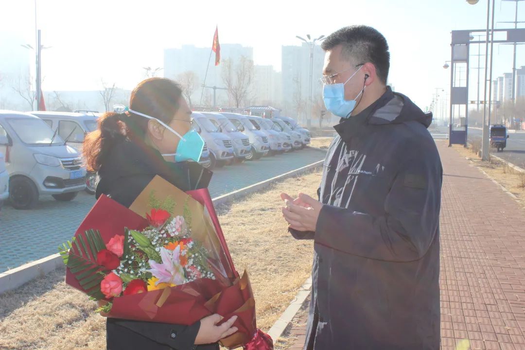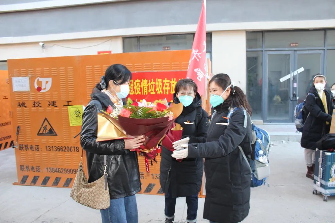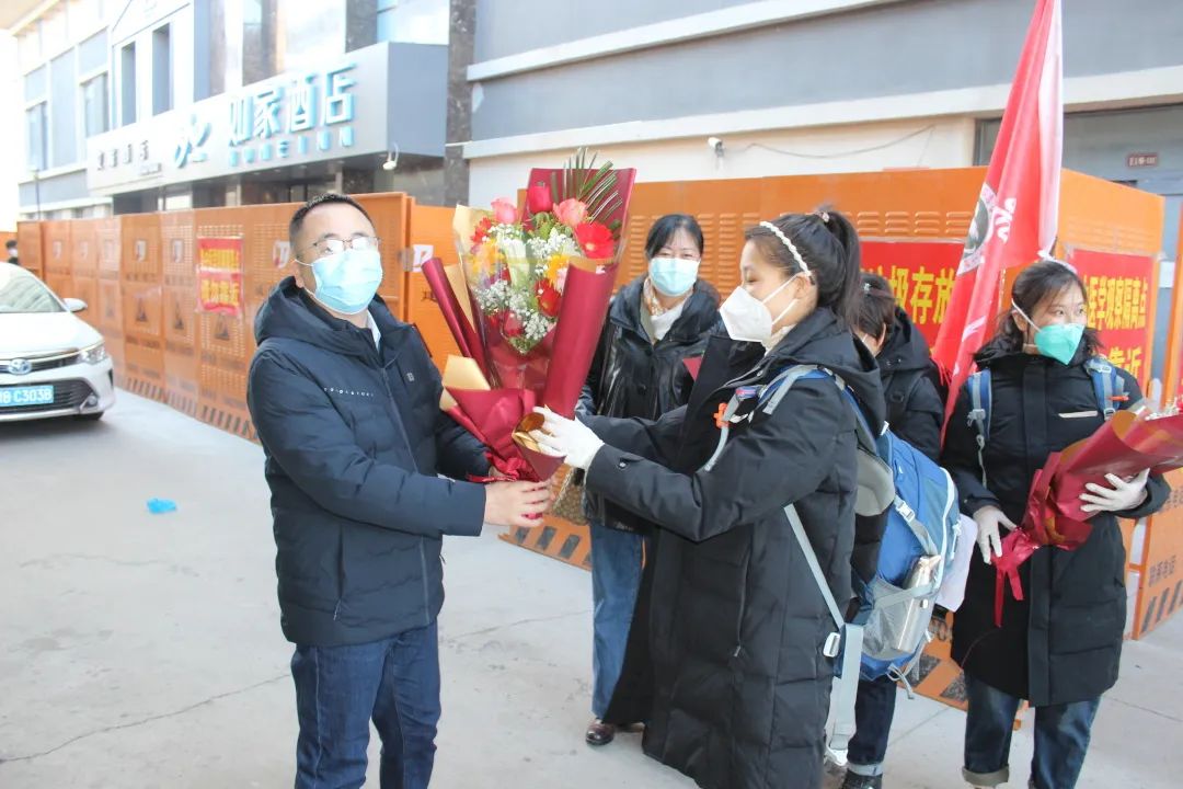 11月15日,我院支援呼和浩特医疗队在酒店完成10天集中隔离后,乘坐专车返回各自家中,接受进一步居家健康监测。医院党委书记刘晖、副院长刘增良、刘忠锦带领相关部门人员与队员家属一同前往隔离酒店迎接,并送上鲜花,欢迎队员们回家。