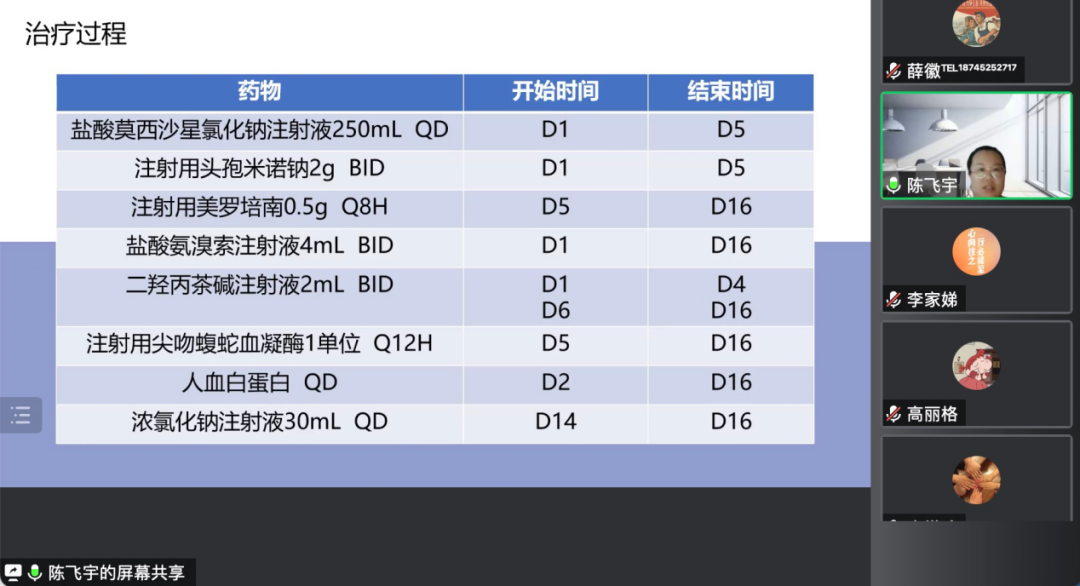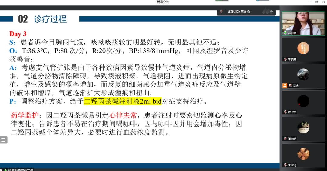 崔立然教授的研究生陈飞宇、李家娣副教授的研究生高丽格分别进行了呼吸科轮转汇报,两位硕士研究生导师及硕士研究生对呼吸内科的大力培养表示感谢,随后与会教师对分享的案例进行点评和交流,对两位研究生的汇报提出指导性意见,并结合医院现有药物探讨如何合理使用抗菌药物,选择性的替代药物进行交流,为临床药师深入临床研究和实践提供新的方案和思路。