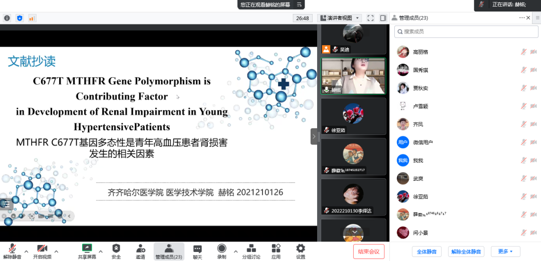 活动过程中,科研科副科长首先汇报了医院2022年度研究生对服务、管理、科研等提出的意见的反馈情况。随后检验科主任徐亚茹培养的2021级硕士研究生赫铭向大家汇报英文文献题目为《C677T MTHFR Gene Polymorphism is Contributing Factor in Development of Renal Impairment in Young HypertensivePatients》(MTHFR C677T基因多态性是青年高血压患者肾损害发生的相关因素),采用中英文对照讲解的方式,为与会的同学们详细介绍了该研究的背景、研究对象与方法、结果、讨论及结论,并围绕本研究的方向阐述了新的研究方向和研究启示。