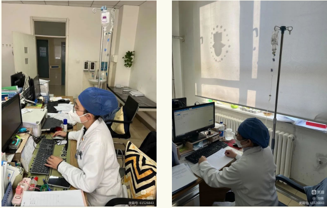 随着阳性患者的不断涌入,科室医生护士也陆续出现发烧、咳嗽等症状,护士长张雅楠只休息2天,待发热症状缓解后迅速返回工作岗位,家里的俩个孩子也在发烧,但她更放心不下科里的患者。主治医生王东霞发热症状缓解后,咳嗽低热,肺部CT提示支气管肺炎,她依然坚守岗位,带着病体查完房坐在电脑前边输液边工作。于悦医生出现心悸、头晕症状,检查心电图和血化验后才知道自己出现心肌炎、心脏早搏,但她也同样带病工作,下班回家再给自己输液治疗,所有医生只在发热严重的当天回家休息,烧退了都不约而同的回来上班,默默的履行救死扶伤的使命,护士们也是同样拖着病体穿梭在病房中,那几天,他们虽然面漏憔悴,却精神不倒。