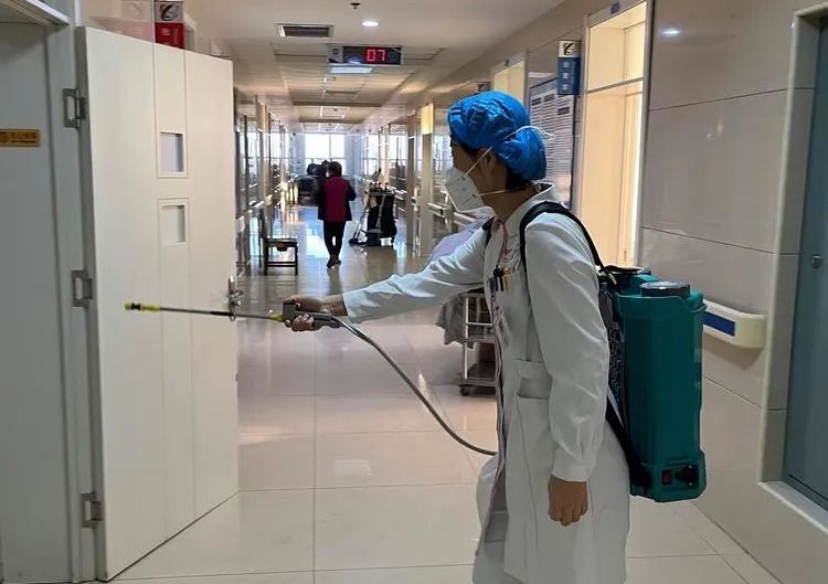 元旦佳节,千家万户沉浸在迎新年的气氛里,神经内科五病区所有的医生护士与科里的60余名患者共同渡过,此时科里有11重症患者,监护仪、吸氧、雾化等设备都是抢手的宝贝,他们每天早上迎着清晨的曙光踏上这场没有硝烟的战场,分工明确,密切配合。雾化组、肌注组、护理组、配液组各司其职忙碌起来,满满三大车的输液,墙上记满特殊处置,护士长忙完配置组工作就开始协调床位,安排新入院患者,每日两次消杀,瘦弱的身躯背起40斤的消毒装置,患者调侃她是女汉子。