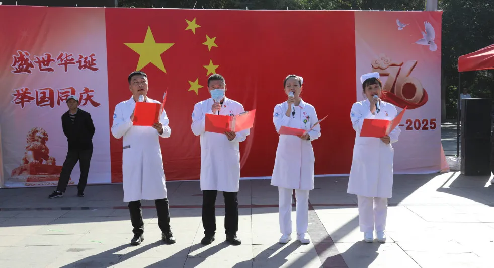 30日上午9点,一段悠扬的音乐在红岸公园上空响起,义诊人群中,我院医护人员暂时放下手中的工作,拿起麦克风,随着音乐唱起了《今天是你的生日中国》《我和我的祖国》《歌唱祖国》,歌声宛转悠扬,朗诵铿锵激昂,现场的医护人员和前来义诊的百姓受到现场热烈气氛的感染,都不约而同地跟着大声唱起来,歌声响彻云霄。不少市民一边跟着哼唱,一边拿出手机记录下这动人的瞬间,大家手中挥舞的五星红旗与脸上的笑容相映成辉,成为红岸公园当天最美丽的风景线。