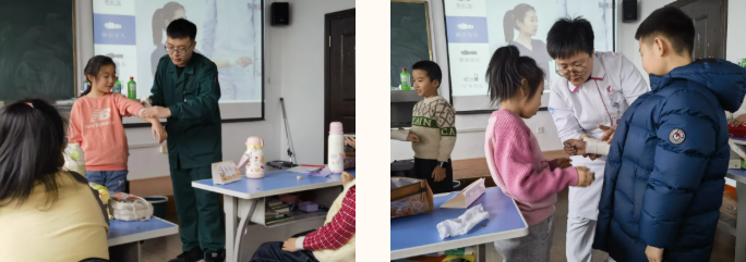 第六天的急救科普课程更是实用又有意义。医院科普讲师团的马燃、张峰老师们现场示范消毒、包扎的正确方法,用生动的案例讲解急救知识,还为孩子们准备了模拟道具,让大家亲手实操练习。孩子们学得格外认真,小心翼翼地为小伙伴包扎,一步步跟着老师的步骤操作,很快就掌握了基础的急救小技能,纷纷表示“以后遇到小意外,我也能帮忙啦”。