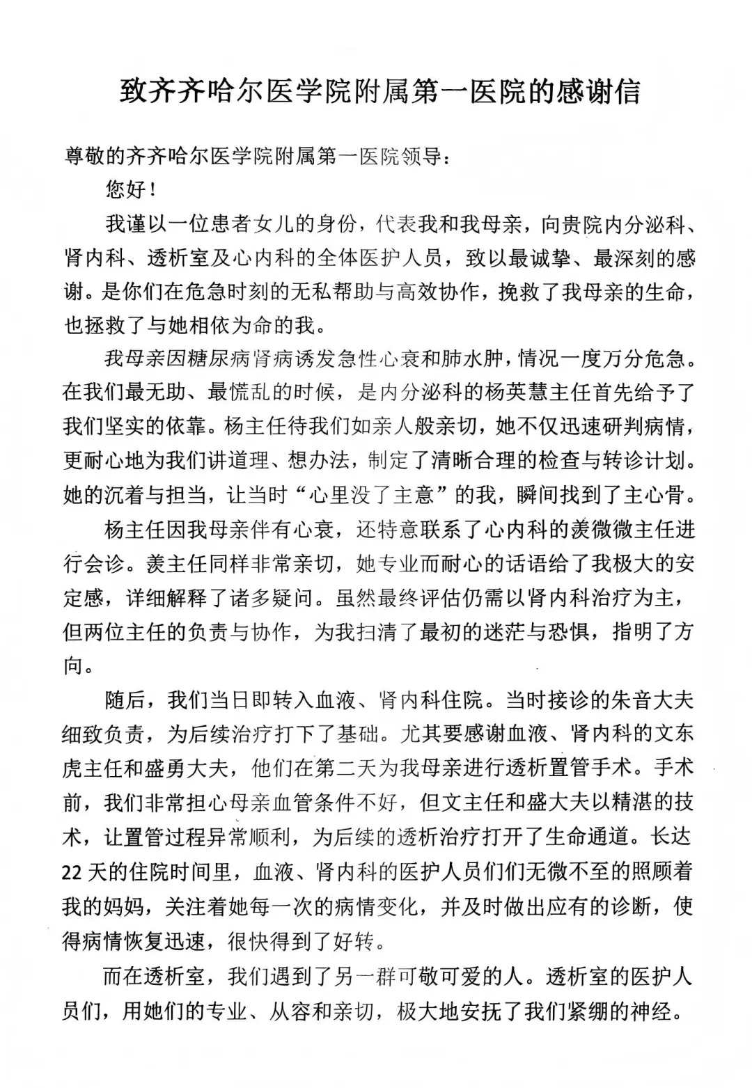 “你们救了我母亲,就等于救了我们这个家。”家属在感谢信中写道,字里行间满是对医护人员的信赖与感激。这份认可不仅是对血液肾内科团队的肯定,更是对医院多学科协作模式的高度赞誉。